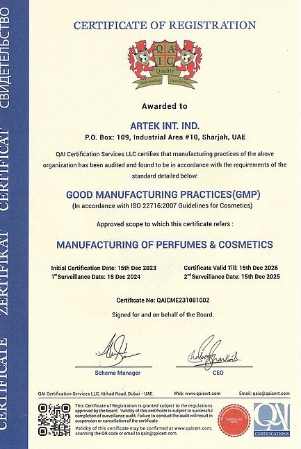 يفخر مصنعنا، أرتك للعطور، بتحقيقه لأعلى معايير الجودة والتميز، حيث حصلنا بفخر على شهادات تقدير تؤكد تميز منتجاتنا. تلك الشهادات ليست مجرد إنجاز، بل هي علامة على التفاني والاهتمام الذي نوليه لتقديم تجارب عطرية فريدة واستثنائية. تأثير هذه الشهادات يتجلى في رفع مستوى معاييرنا، وتعزيز سمعتنا كمصنع رائد، مما يعزز الثقة في منتجاتنا ويجعلها تتميز بلا مثيل.”